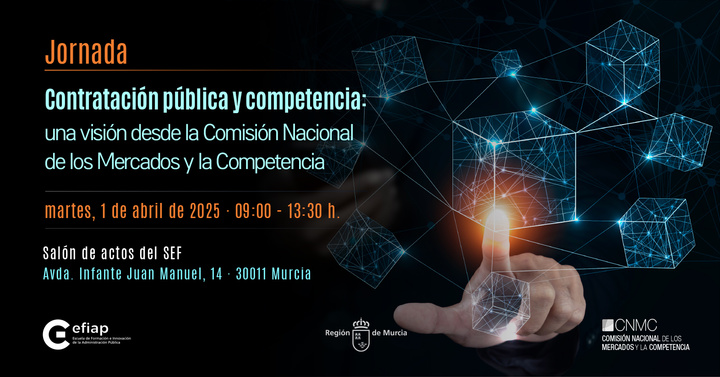 La Escuela de Formación e Innovación de la Administración Pública de la Región de Murcia (EFIAP) y la Dirección General de Consumo de la Consejería de Empresa, Empleo y Economía Social, han organizado para el próximo 1 de abril la Jornada sobre Contratación pública y competencia: una visión desde la Comisión Nacional de los Mercados y la Competencia. Las intervenciones programadas tendrán lugar en el Salón de Actos del SEF (Edificio Administrativo Infante, Avda. Infante Juan Manuel, 14, 30011 Murcia) a partir de las 09:00 de la mañana.