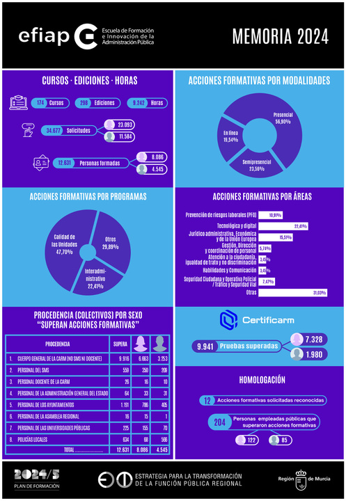 Un total de 12.631 empleados y empleadas públicas superaron durante el pasado año 2024 alguno de los 174 cursos, con 298 ediciones, organizados por la Escuela de Formación e Innovación de la Administración Pública de la Región de Murcia (EFIAP). Casi la mitad de esas acciones formativas se incluyeron en el Programa de Calidad de las Unidades (PCU), con un 47,7 por ciento, mientras que el Programa Interadministrativo ofreció el 22,4 por ciento de las acciones formativas.